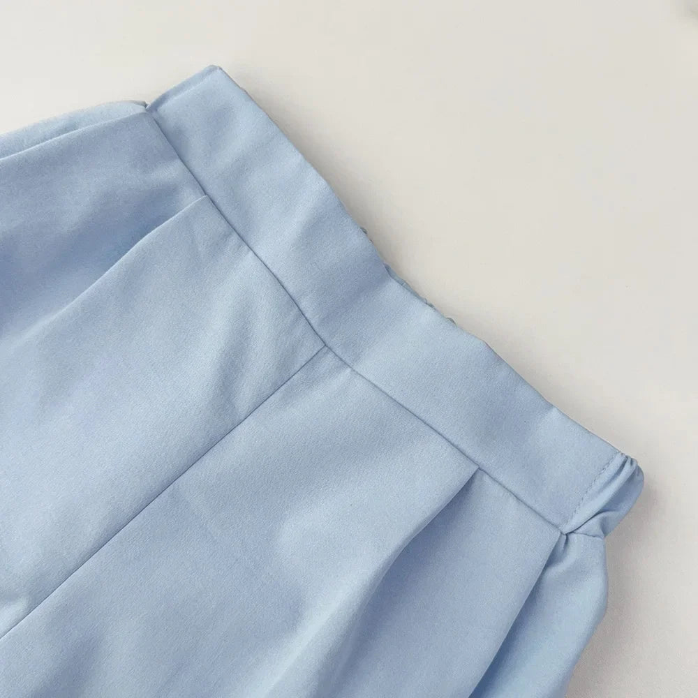 Modieuze tweedelige set– Bestaat uit een mouwloos topje met knoopsluiting en een bijpassende short.
